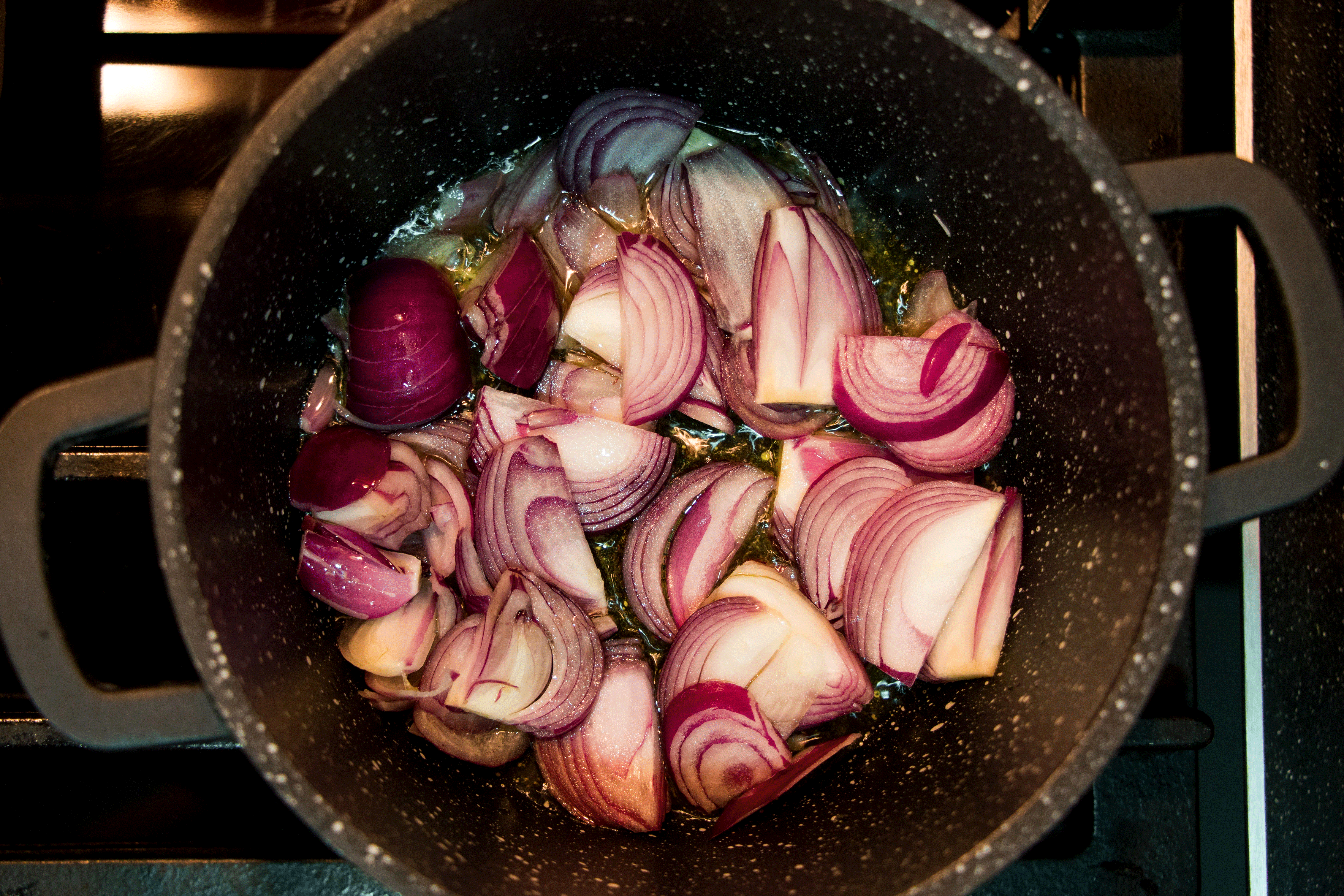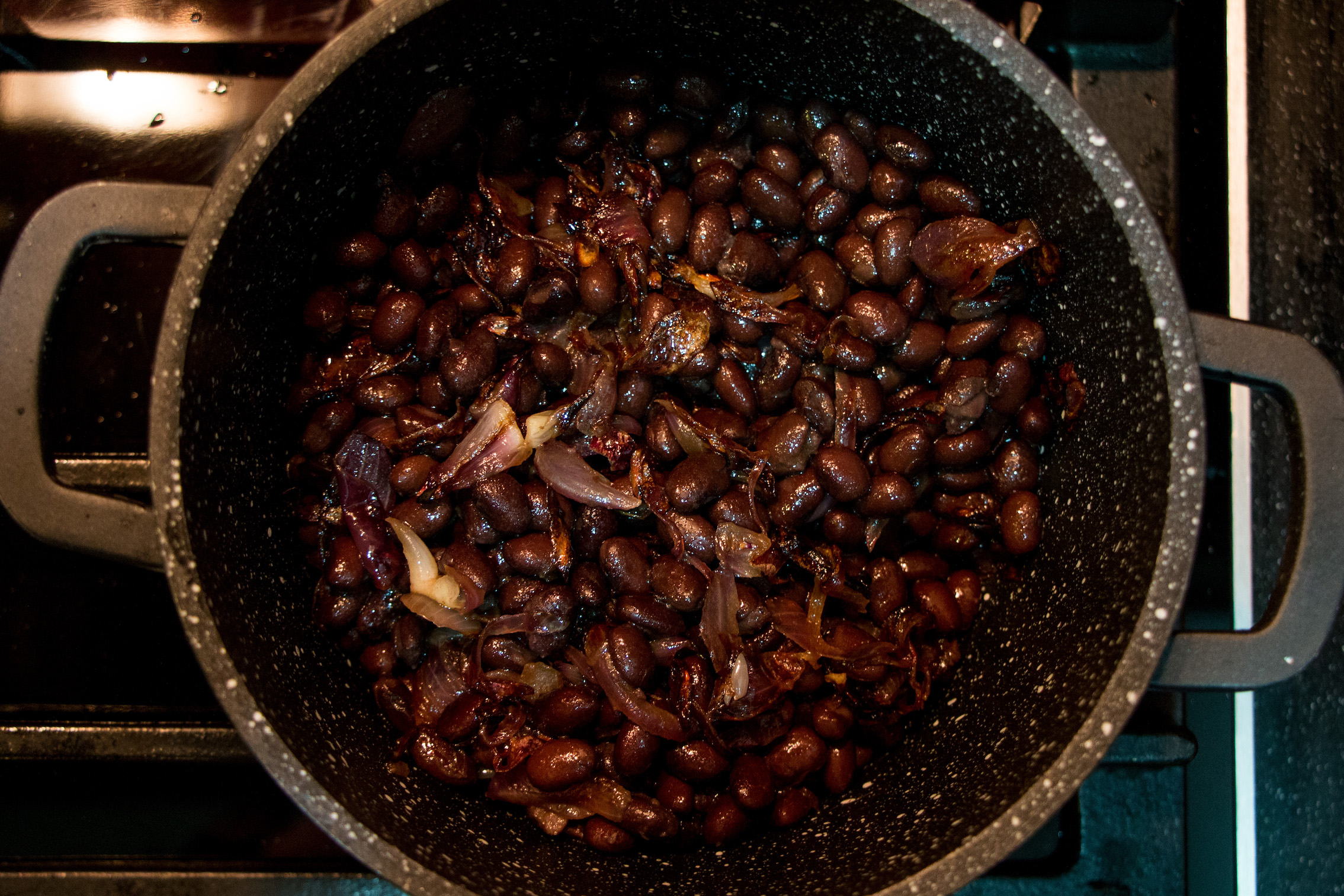 - Add your onions to a hot pan and let it them fry off for a little while until they’re golden. Add your chilli powder here as well, to cook off the powder a bit. Then add your beans and make sure to have the flavours incorporate well. Once you’re satisfied it’s well-mixed, take it off the heat.