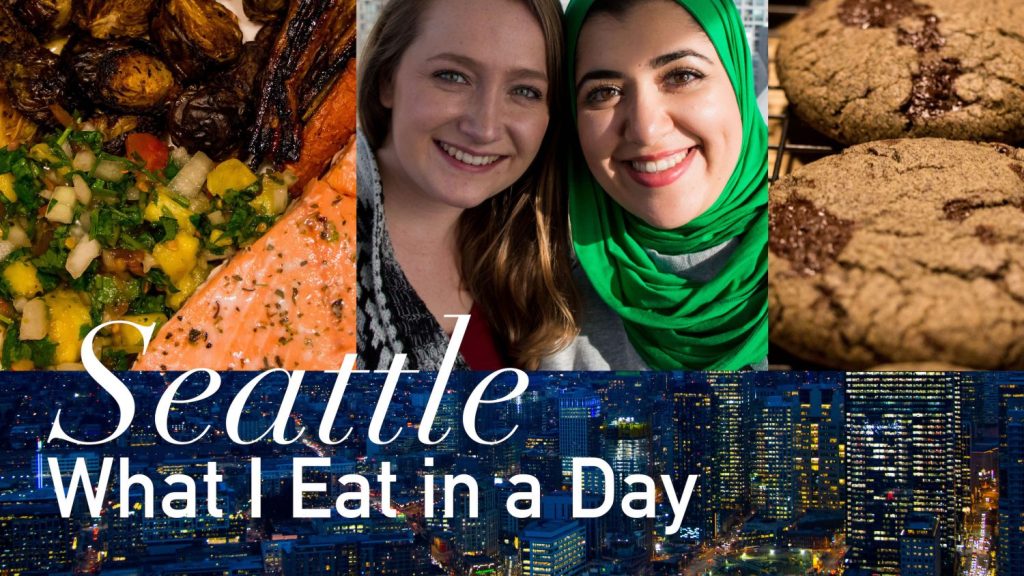 We hit up all the classic tourist spots on my first full day in Seattle — and the boys over at the Flying Fish market popped an apron on me and started throwing fish at me. We also stopped by the first Starbucks store, went up the Space Needle, and up on the Ferris wheel overlooking the water. It was a hilarious day, lots of walking and sightseeing but also pretty low-key, with a night ending in cookies and a Sleepless in Seattle rewatch. I hope you guys like this one, it was a ton of fun putting it together.