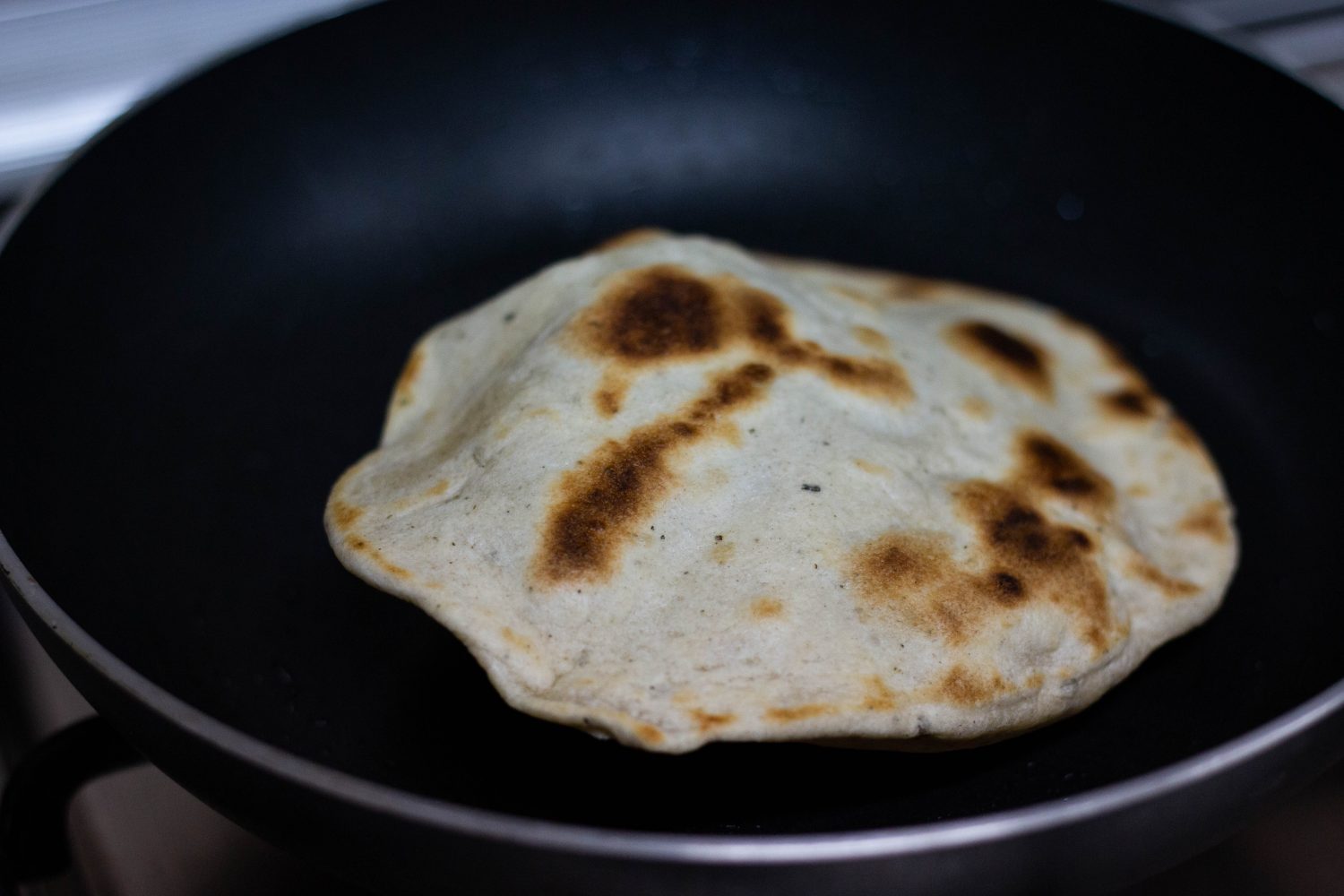 - In a very hot pan, add a little bit of olive oil (very little, I wipe off excess with some kitchen roll) and pop each naan on there for 2-3 minutes each side, until it starts to char nicely